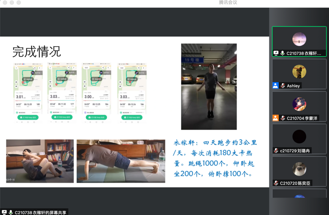 其次,引导学生积极锻炼,关注学生身心健康。线上学习,学生最需要放松身心、强健体魄,为此,各班通过同伴示范、小组打卡、班级表彰等各种形式鼓励同学们加强锻炼,以此促进身心健康。
