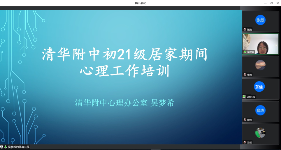 初21级心理老师吴梦希和班主任们分享了近期疫情居家学习过程中,初二学生可能的压力来源和心理状态,以及如何从个体和群体工作层面促进学生的心理健康。