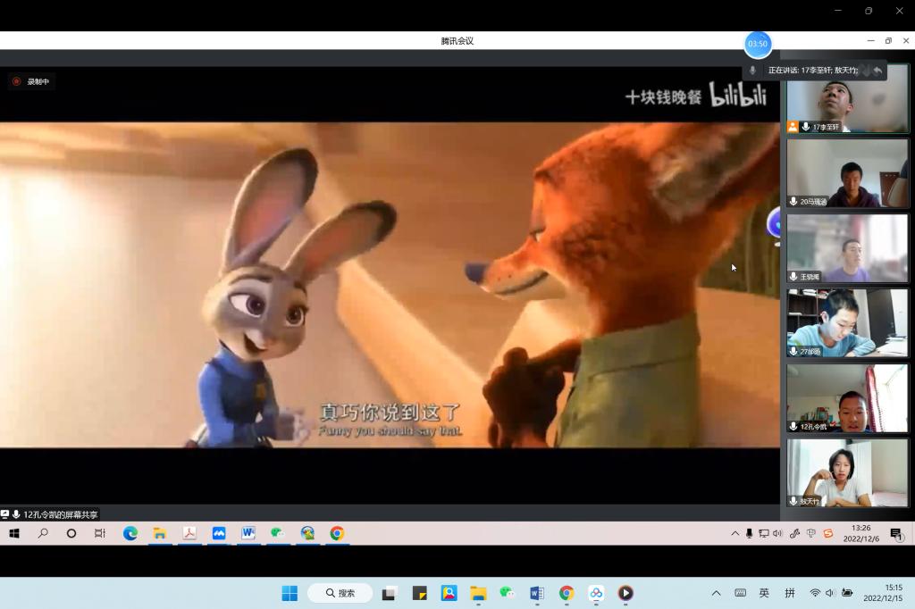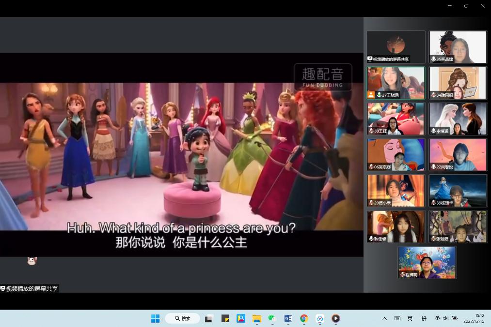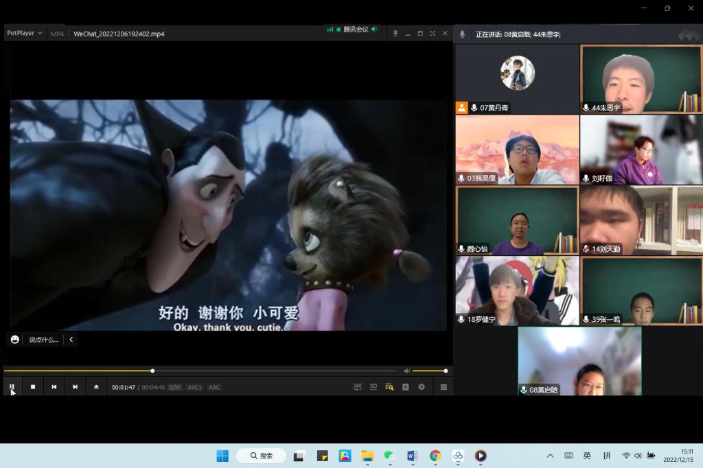 12月13日下午,本次配音大赛以腾讯会议直播的形式拉开了帷幕。大赛邀请到了8位专业评委以及特邀嘉宾特级教师王英民老师。比赛现场以抽签形式决定代表班级参赛的小组。同学们个个实力强劲,口语纯正、感情充沛,表演惟妙惟肖,堪称一场精彩的英语视听盛宴。最终,比赛最终评选出多个团体奖项、个人奖项、以及优秀海报奖。