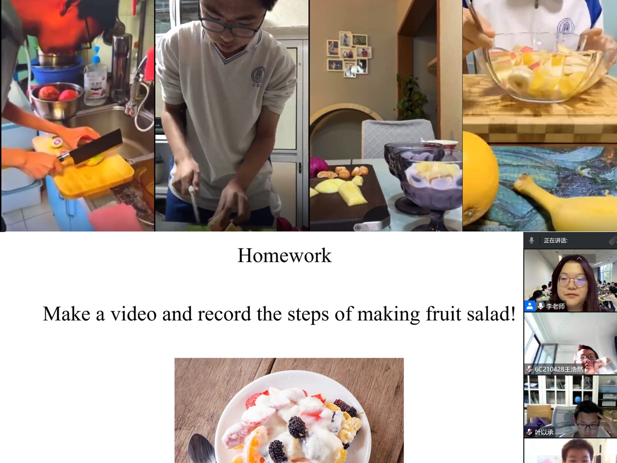 英语备课组组康喆老师巧用在线平台,与学生进行良好互动,及时反馈。如使用腾讯会议的互动批注以及智学网作业的语音评论。此外,为调动学生课堂积极性,还设有课前分享英文笑话环节。李兴艺老师开展了丰富的英文实践活动。比如,请学生制作水果沙拉,并拍摄视频讲解步骤。学生在实践中锻炼了动手能力和英文表达能力,拓展了英语视野,体验到了英语线上课程的乐趣,争当小小居家君子。