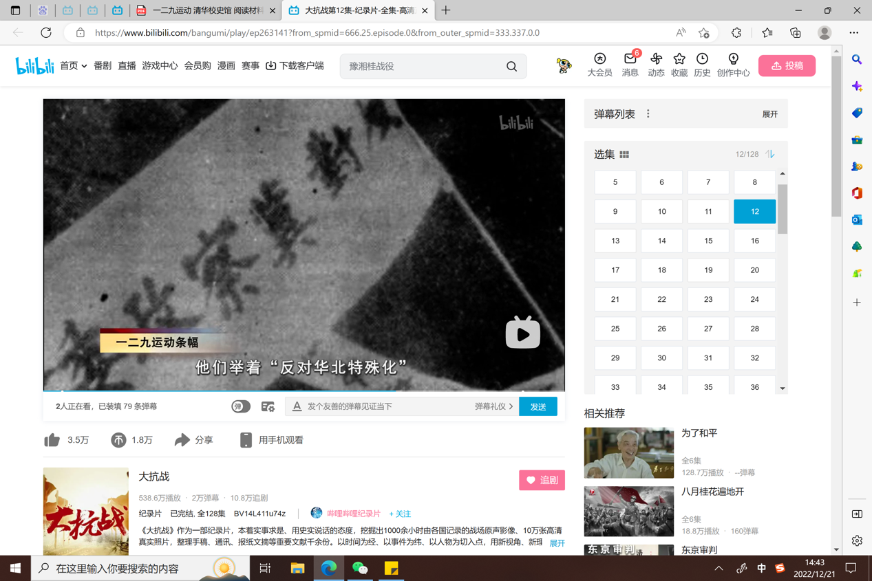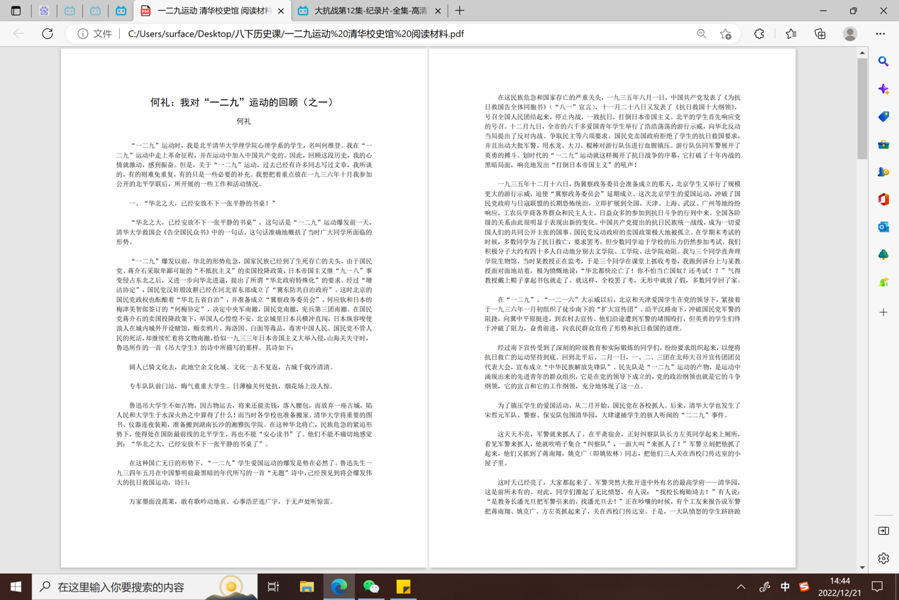 初21级历史备课组充分利用线上教学的特点,开展“一二·九运动”主题课程。组织学生在一二·九运动八十七周年之际,观看《大抗战》纪录片之“一二·九运动”,阅读和讨论清华大学校史馆藏电子版清华大学校友所著《一二·九运动回忆录》,提升学生史料分析能力,培养学生家国情怀。