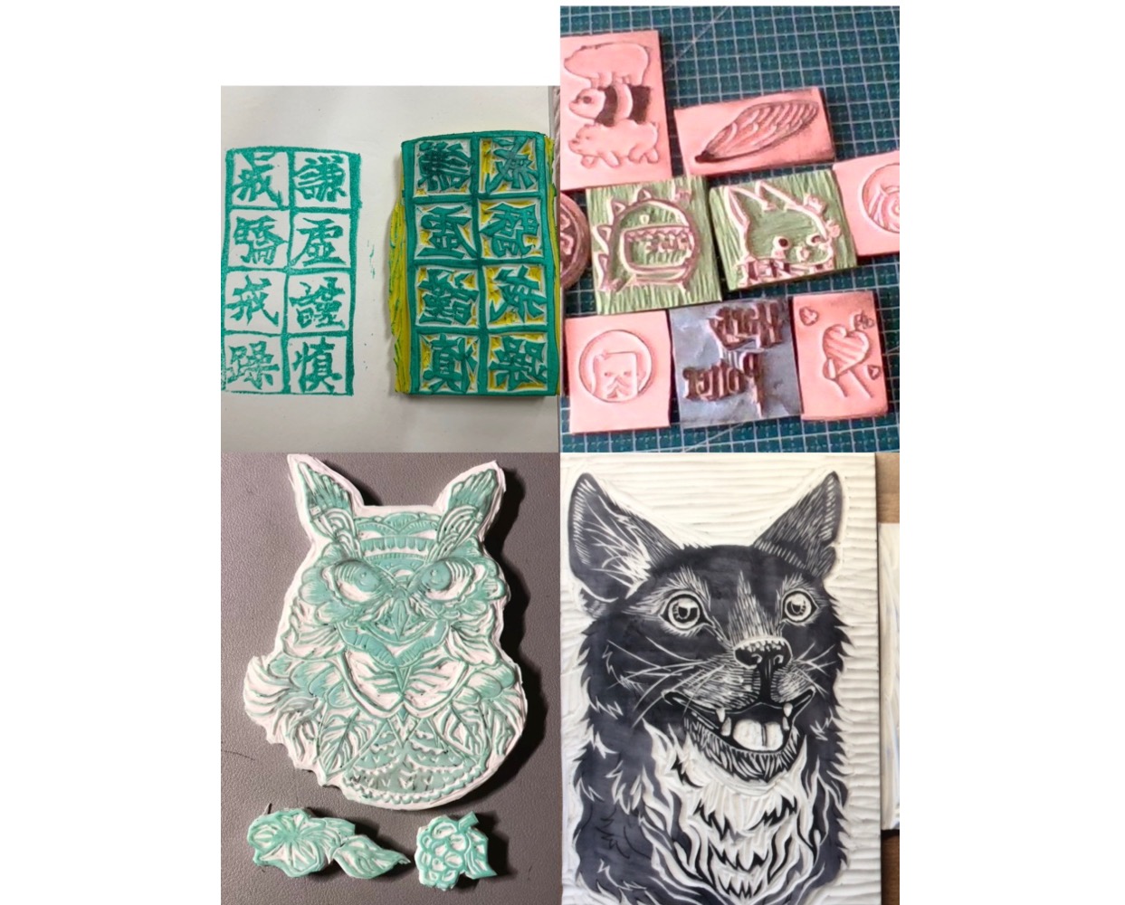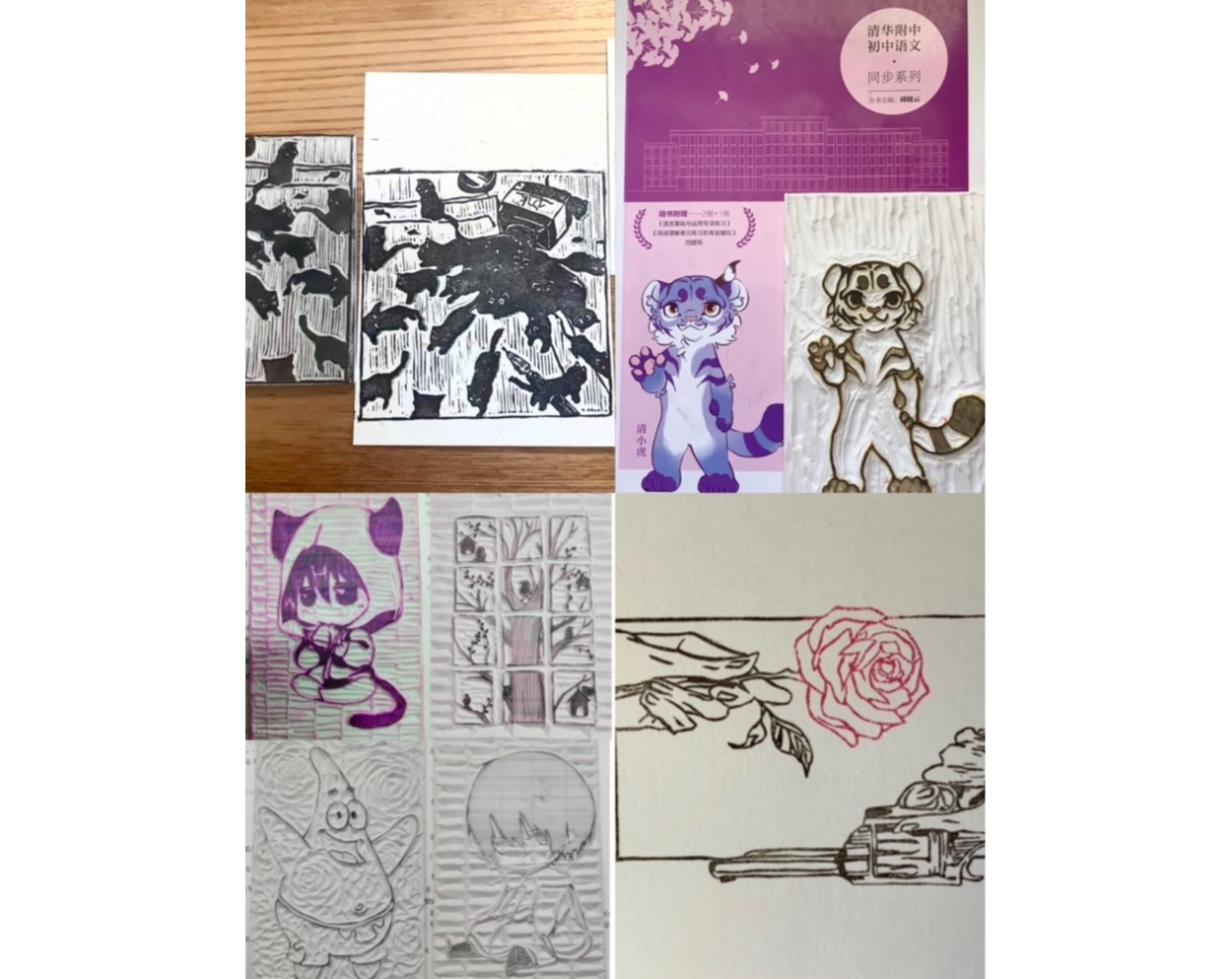 同学们在线上美术课上制作的橡皮章作品