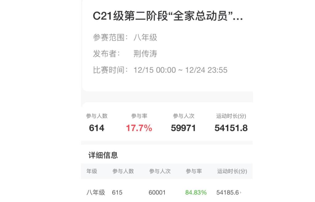 体育备课组线上教学期间,举办了“全家总动员”线上体育锻炼打卡积分活动,活动旨在提高学生身体素质,提升家庭氛围,学生和家长都积极参与活动,线上活动取得不错的效果。