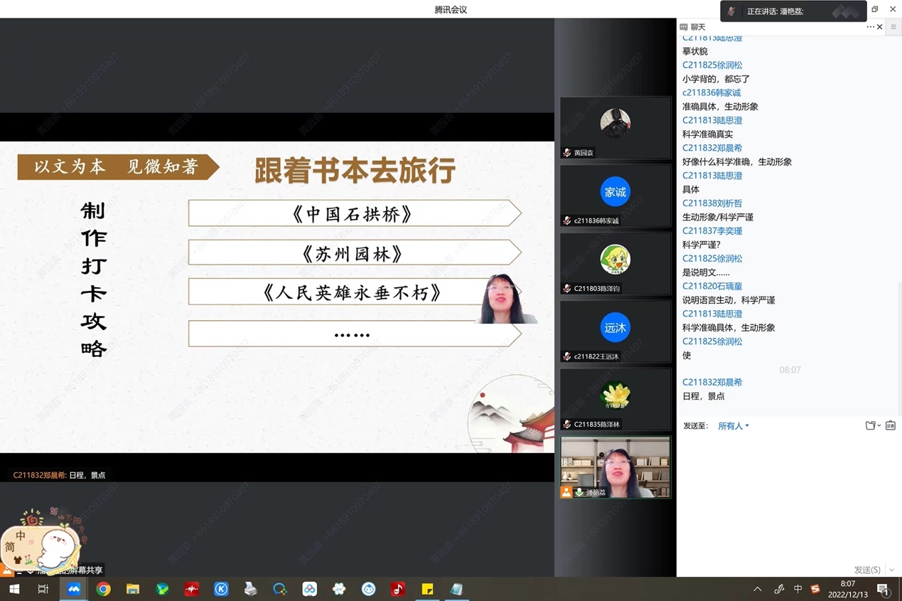 初21级语文备课组在线上教学期间,充分利用线上教学的优势各展其才,带领学生遨游丰富多彩的文学世界。《背影》和《白杨礼赞》的配乐朗读“声入人心”,《昆明的雨》开展的诗画活动精彩纷呈;纪录片《超级工程·中国桥》和《苏园六纪》带领学生走进说明文的崭新世界,跟着课本“云旅游”;在古诗文单元,老师们采用了线上接龙背诵、共享批注、你画我猜、《愚公移山》辩论会等多种新鲜有趣的教学方式,带领学生们一起拜访古代先贤,感受文字魅力。