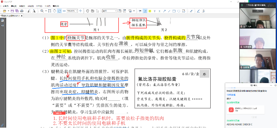 生物高祺老师在生物习题讲解过程中,通过共享软件内屏幕,同时关注学生摄像头中的学习状态,在聊天区进行的提问与发言。在习题讲解中,使用标记工具分析题干中重要信息,掌握做题技巧。在学生回答问题过程中,使用腾讯会议的互动批注功能,与学生充分互动,提升网课的互动性以及交流的有效性。