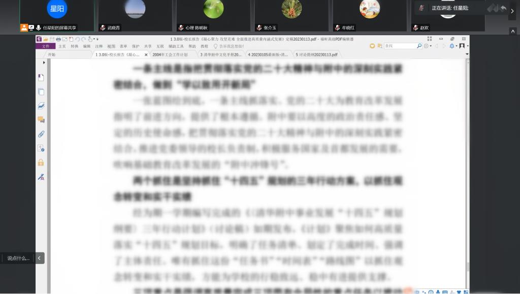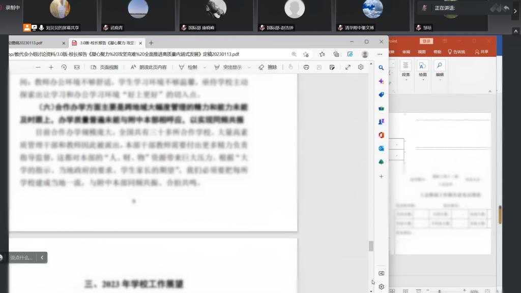 校长方妍做题为《凝心聚力 攻坚克难 全面推进高质量内涵式发展》的工作报告。她首先全面介绍了过去一年,全体教职工克服疫情困难,在全面加强党的领导、教师队伍建设、教育教学全面发展,服务保障水平、国际教育和对外合作办学等方面取得的突出成绩。在肯定成绩的基础上,她深刻分析了新形势下学校面临的几个问题和挑战,切中肯綮,务实求真。最后,方妍就2023年学校的重点工作进行了展望,希望全体教职工以本次教代会为契机,深入学习讨论学校“三年行动计划”,最大程度凝聚共识,调动积极性,以知行合一的行动力,形成久久为功的战斗力,去争取更大的胜利。随后方妍还向大会做了2022年度学校财务公开报告,接受全体教代表的监督。