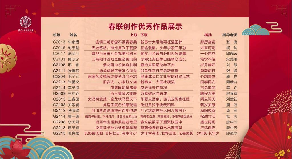 一个多月的线上学习,大家暂别校园,相聚“云”中,却阻挡不了附中师生进行春联创作与书写的热情。岁末年初,澳门博彩在线在线上开展第十二届新年春联创作与书写大赛,活动围绕“翰墨丹青心向党,踔厉奋发新征程”为主题,共收到学生楹联对句作品400余份、春联创作近200幅,书写作品近百幅,寓意吉祥的对联字字寄托着附中学子深刻感悟到祖国的繁荣昌盛与青年学子的责任担当。