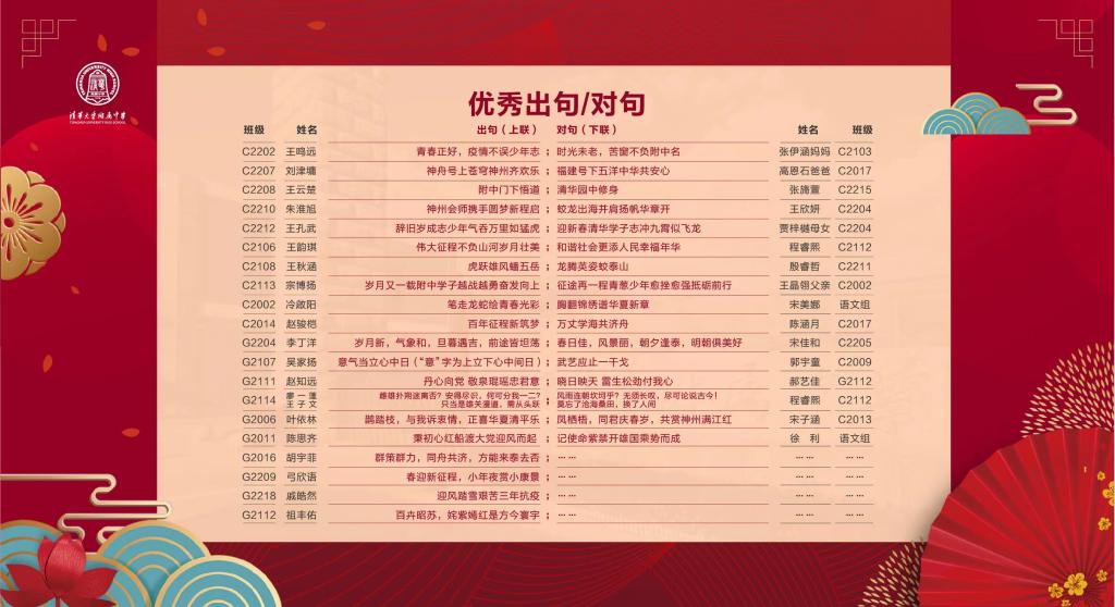 在楹联对句环节,师生及家长各尽其才,佳联妙对,尽显风流。楹联对句通过微信平台征集,语文教研组精心挑选出了最佳出句20句,最佳对句16句。