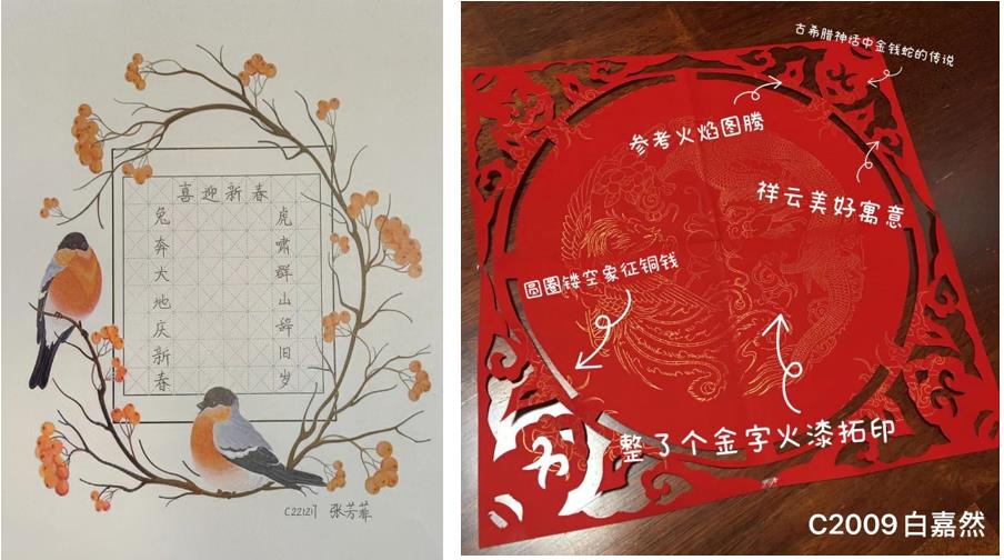 本次活动还特别新增了玩转“春联+”环节,旨在鼓励同学们将创意与传统文化相结合。同学们提交的作品,将关于兔年的字和画相结合,并融入窗花元素,承载了同学们对新的一年美好生活的殷切期盼和良好祝愿。