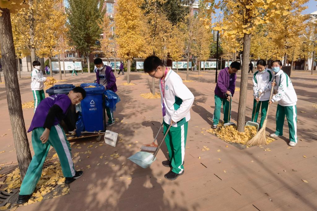 参与“水行行动”班级在清理校园落叶