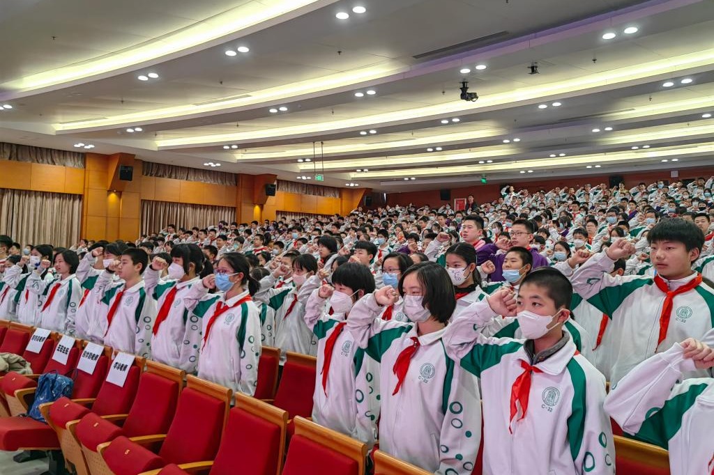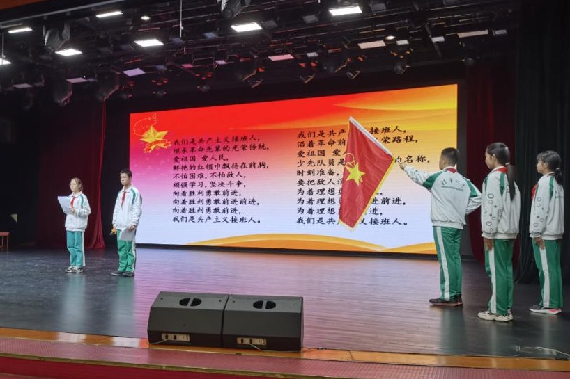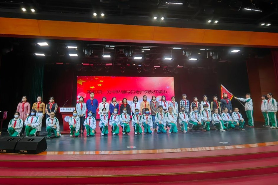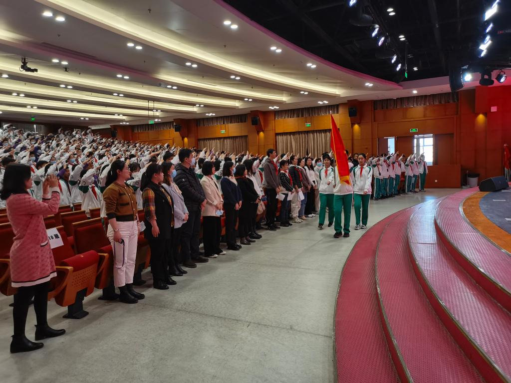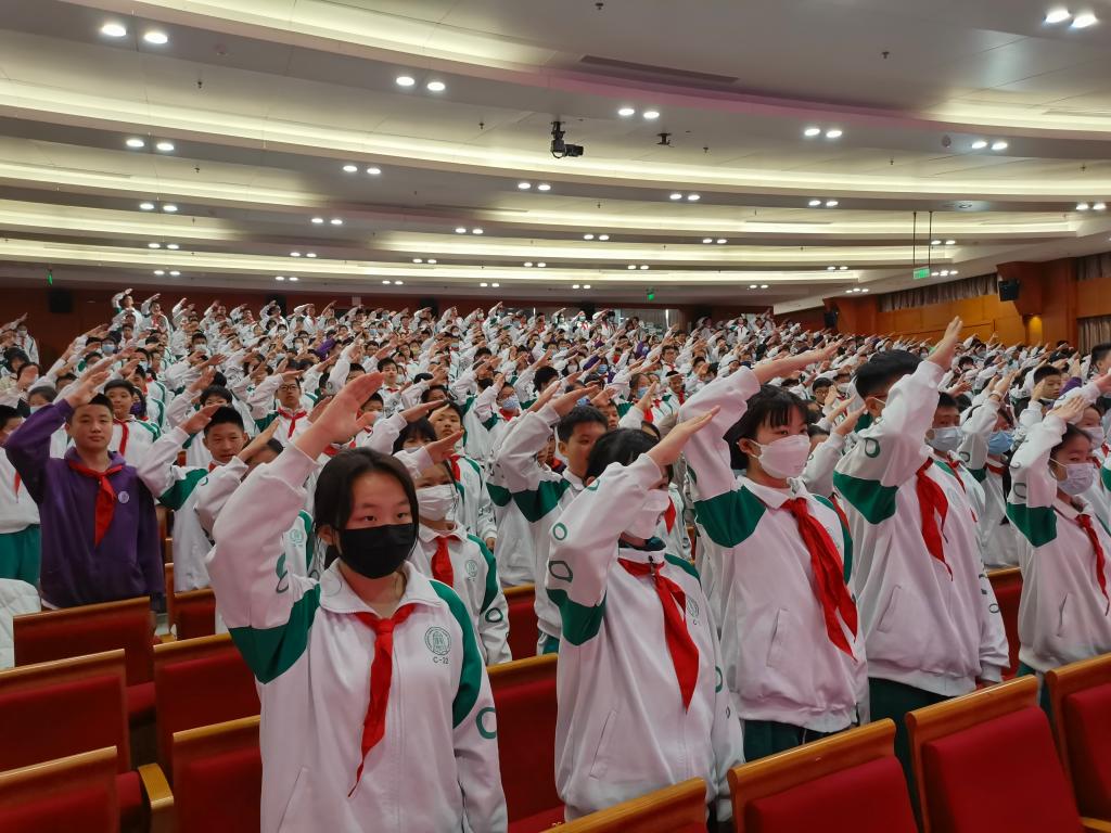 紧接着,全体师生共同唱响《中国少年先锋队队歌》,嘹亮的歌声在报告厅内回响。