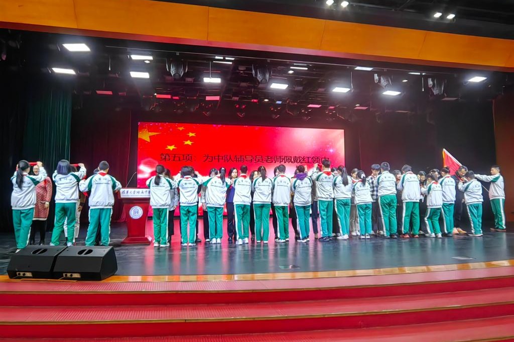 各中队组织委员为中队辅导员戴上了鲜艳的红领巾,感谢老师们在学生成长道路上的付出和引领。随后,初22级全体少先队员高举右拳,在少先队大队长初2205班王懿杭同学的带领下,重温了入队誓词。