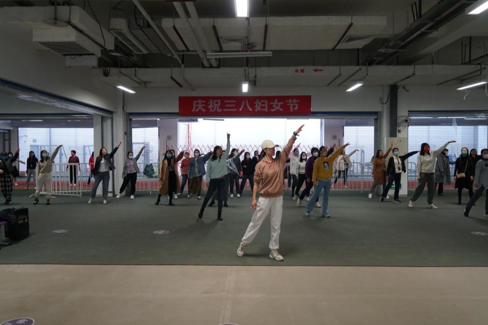 3月8日傍晚,女教职工们利用课余时间在体育馆地下一层进行集体健身操锻炼活动。曹海翔代表学校党委向女教师们送上节日问候,对女教师们在自己平凡岗位上取得的成绩给予充分肯定。最后,他叮嘱大家在工作之余,多进行体育锻炼增强体质,以更好的状态投入到工作中。在体育组李冰老师的带领下,现场一百多位女教师配合着音乐跳动起来,气氛欢快热烈。