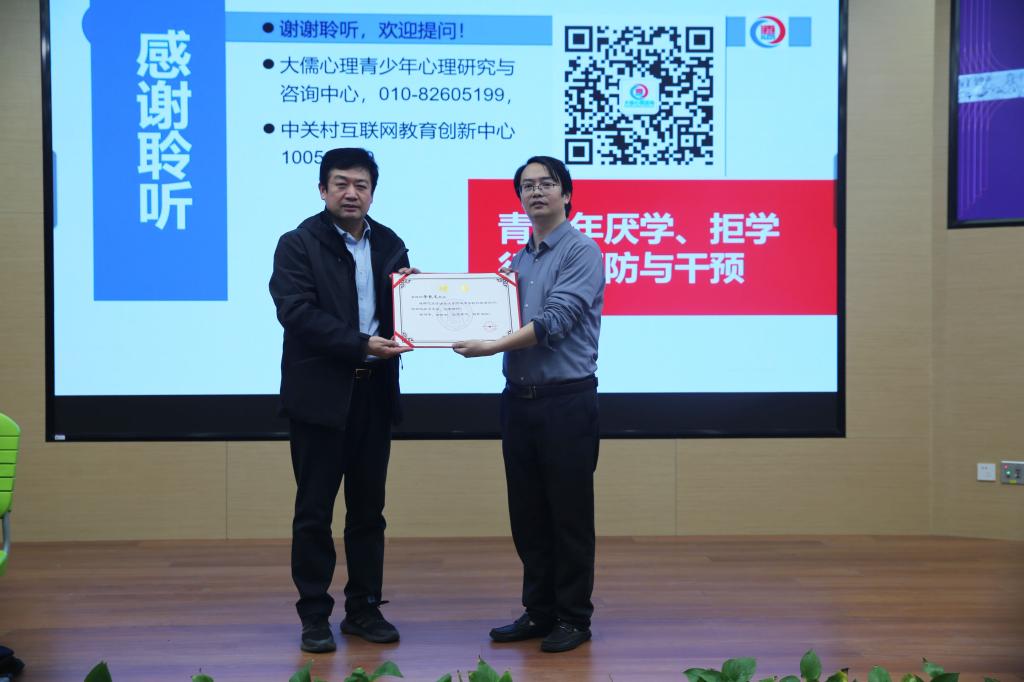 白雪峰副校长(左)为徐凯文博士(右)颁发聘书,聘请其为校外教育顾问