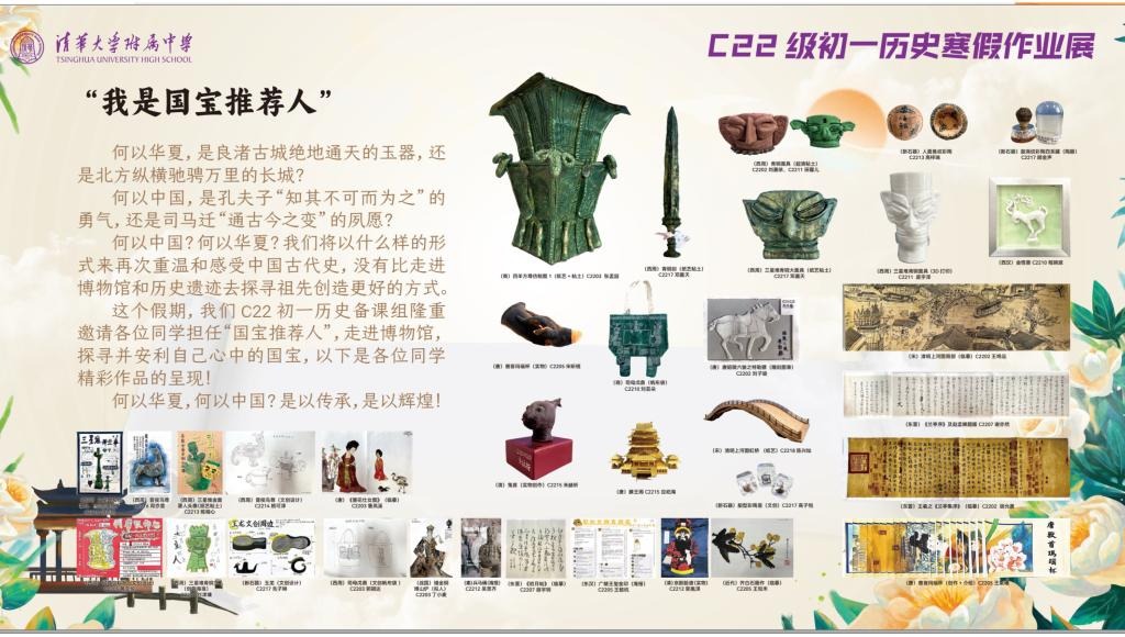 3月9日,“我是国宝推荐人”澳门网上博彩初22级历史寒假优秀作业在华茂楼208门前展柜进行展览,并配套展板在初中教学楼前展示。本次展览得益于教学管理与研究中心主任张苏、资源保障中心副主任魏兵的大力支持,历史教研组组长宋薇、初一年级组长熊学勤老师的指导与协调。