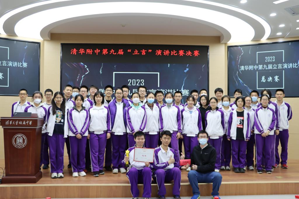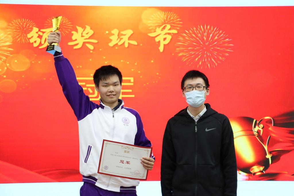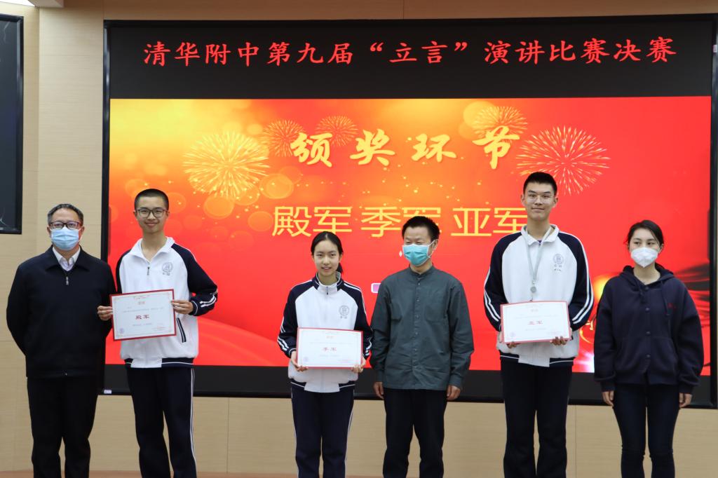 最后,主持人王彦鲁同学公布了获奖名单,最终,王煊璞同学夺得冠军,戚弘毅同学获得亚军,张倍嘉同学获得季军,宋雨轩同学获得殿军。邱道学、邹明、李敏婧和岑逸飞老师上台为获奖选手颁奖。
