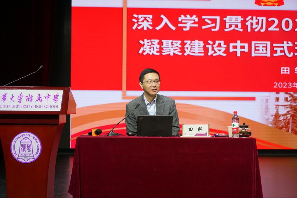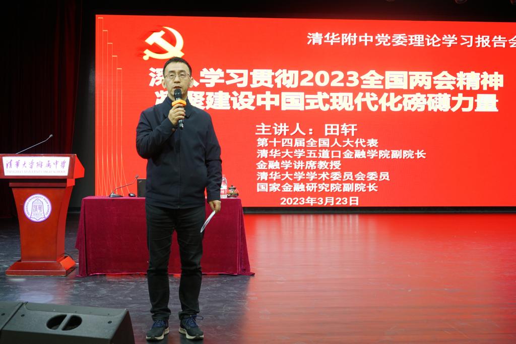 3月23日下午,澳门网上博彩党委组织全校教职工学习2023年全国两会精神。第十四届全国人大代表、清华大学五道口金融学院副院长田轩受邀作题为《深入学习贯彻2023全国两会精神,凝聚建设中国式现代化磅礴力量》的专题报告。报告会由澳门网上博彩党委书记曹海翔主持,学校全体教职工及业余党校学生共四百余人参加学习。