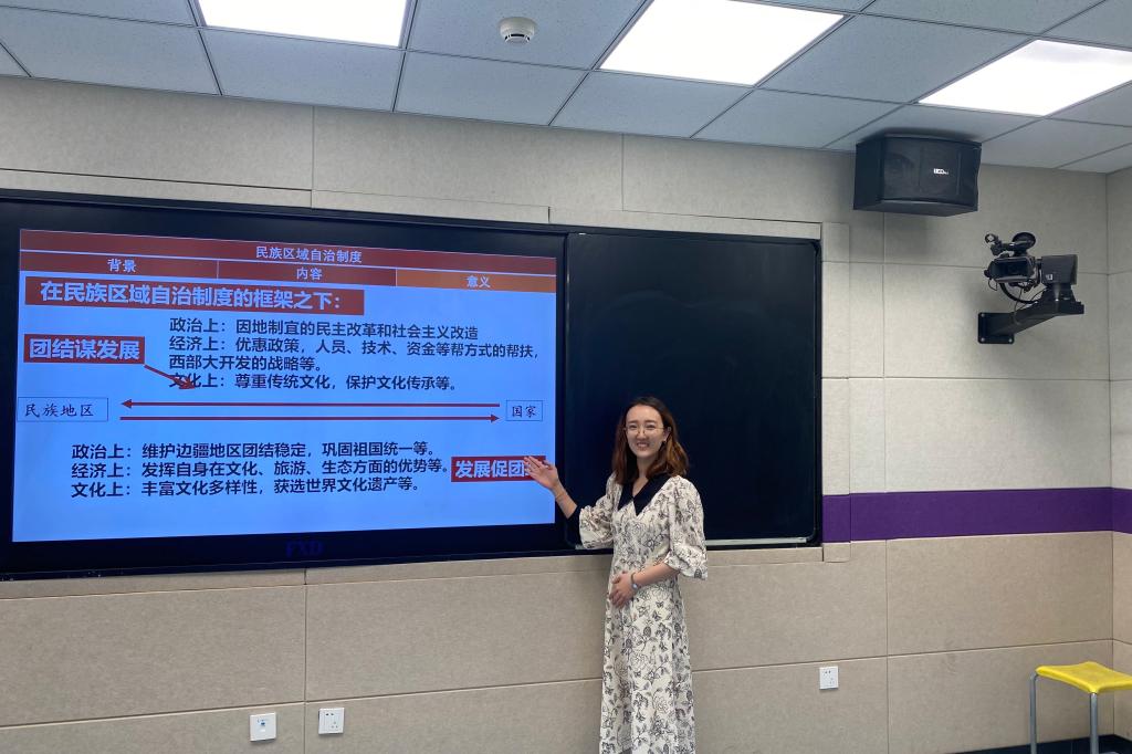 活动第一个环节是澳门网上博彩张月瑶老师为初二讲授新课《民族大团结》。海淀区历史学科新教师们在认真聆听和记录课堂相关内容。随后,张月瑶老师从本课的教学设计、问题串拟定、选材布局等方面为新教师们说课。