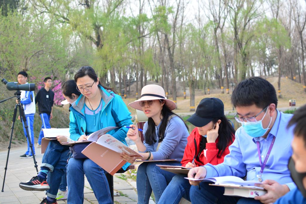 在动物学专业教师高祺和房鹏的带领下,生物组教师参与识别了圆明园丰富的动物、植物物种。沿着圆明园湖边,老师们观察到了黑天鹅、黑水鸡、骨顶鸡、苍鹭、鸳鸯、鸊鷉、绿头鸭、喜鹊等圆明园常见物种,分析了华北地区常见鸟类的习性以及近年来圆明园鸟类物种丰富度提高的原因。老师们沉浸在人与动物和谐相处的美好画面中,感叹近年来圆明园生态环境治理的可喜成果。