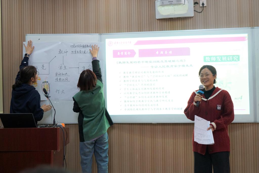 接下来,语文和英语沙龙组青年教师以小组为单位分别进行主题分享展示。汇报采用了对话访谈、主题讲座、成员心得分享等丰富多样的形式。