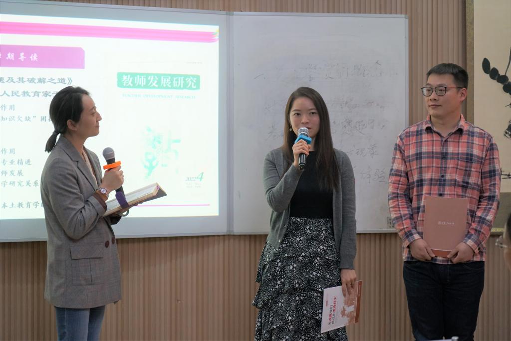 首先,语文沙龙组负责人张佳琪和英语沙龙组负责人吴威分别介绍了于漪先生的教育事迹和本期书目中的访谈内容。于漪先生以自己丰富的实践经验和独立思想,为广大教师深刻阐释和解答了教育教学理论对教师发展的作用、教师“教非所学”与“学科知识欠缺”困扰的破解等十个我国教师发展面临的现实问题,其中既有精辟的理论见解,又有具体的实践策略。