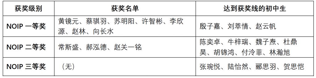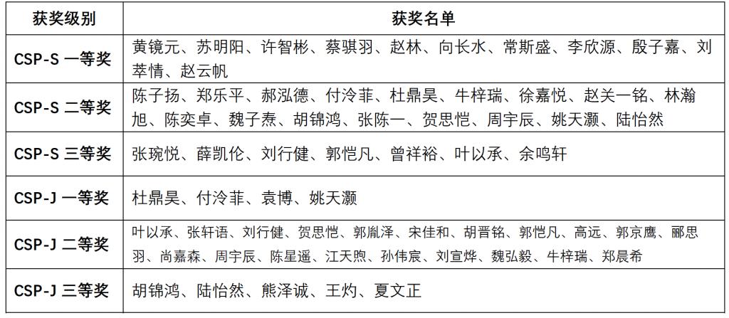 在计算机非专业级别能力认证提高级CSP-S复赛中,11人获一等奖、17人获二等奖、7人获三等奖;在计算机非专业级别能力认证入门级CSP-J复赛中,4人获一等奖、20人获二等奖、5人获三等奖。