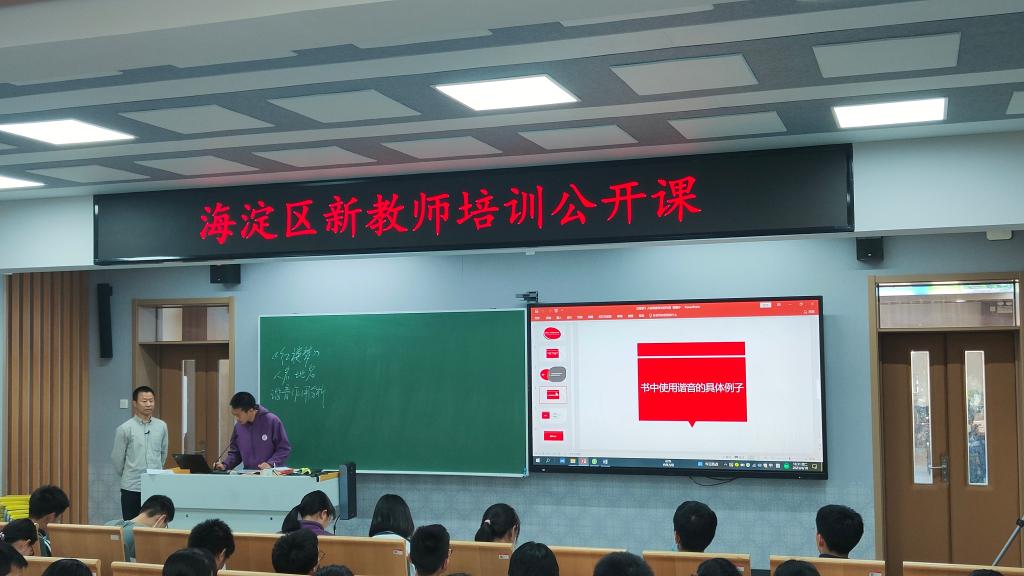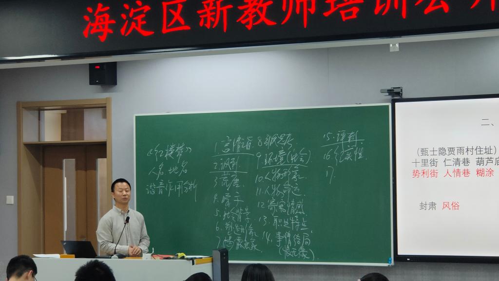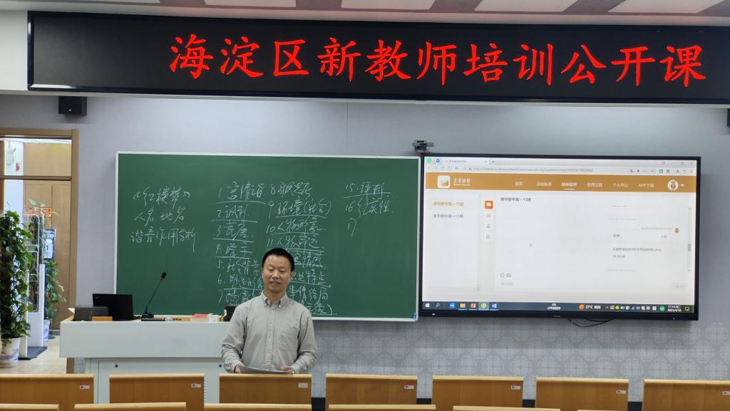 活动的第二阶段,高一语文备课组邱道学老师为海淀区2022年语文新任教师进行了一堂“融媒体教学实践——《红楼梦》地名、人名谐音分析”展示课,课堂以《红楼梦》地名、人名谐音作为分析对象,以小组汇报和小组点评结合的方式呈现出学生学习的过程,最终进行理性化的总结和引导。展示课之后,邱道学老师又结合自身丰富的教学经验与对融媒体教学的独特理解给在场的新任教师进行了一场特级教师与新教师的对话。