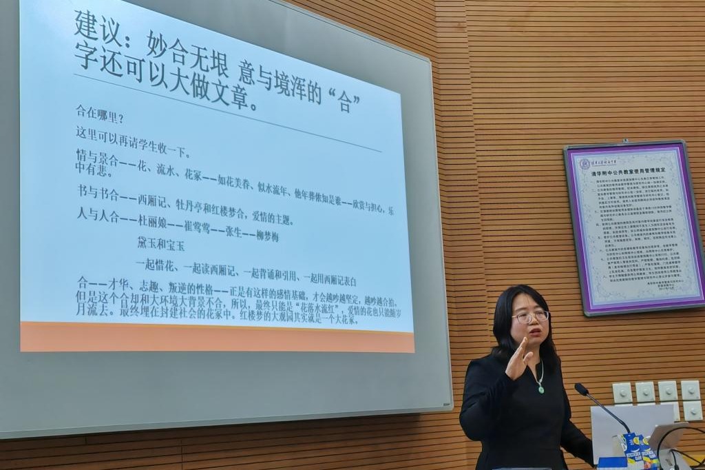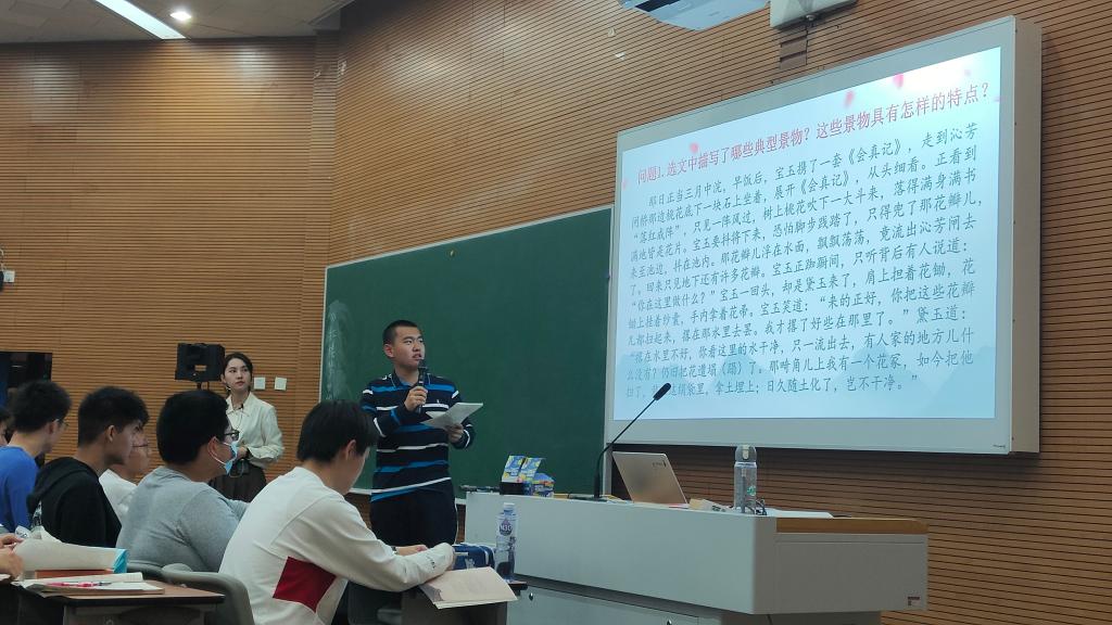 李敏婧老师的“‘妙合无垠,意与境浑’——《红楼梦》的意境美”从“审美”的角度切入文本,以学生海选出的最美片段——“共读《西厢》”作为分析对象,通过小组讨论、小组发言的方式共赏“意境美”,进而形成了赏析红楼梦“意境美”的知识支架。