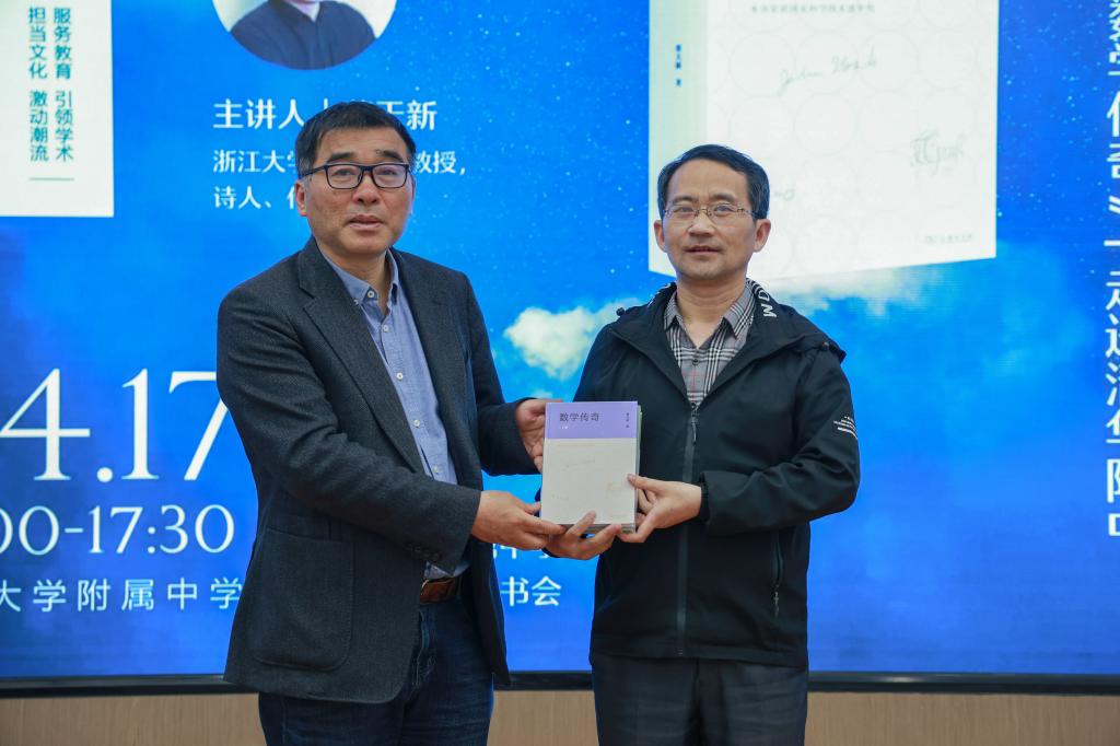 会议伊始,张钦老师对蔡天新教授的求学经历与主要成就进行了介绍。“是数学家,也是诗人,他的著作《数学传奇——那些难以企及的人物》荣获国家科学技术进步奖二等奖。用诗一样的语言描述着伟大数学家的事迹”,张钦老师介绍到。为勉励学生的数学学习热情,蔡天新教授代表商务印书馆向澳门博彩在线图书馆捐赠了最新修订版《数学传奇》(上下册)及两本个人诗集《地铁之诗》《高铁之诗》,徐文兵副校长出席赠书仪式。