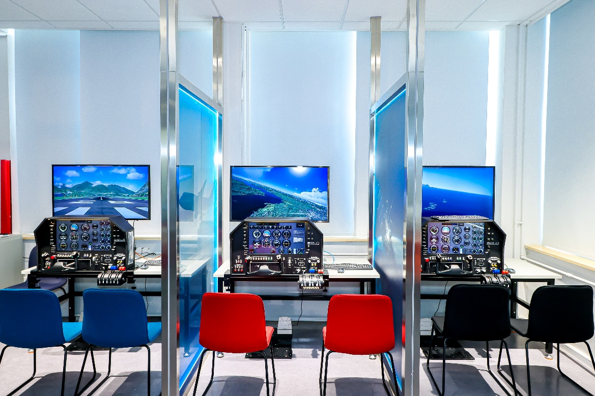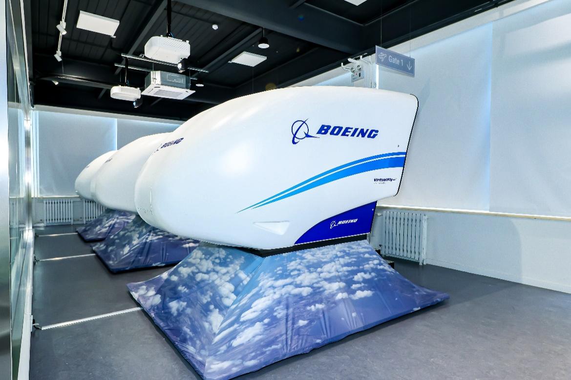 附中校园内配备的“波音·牛顿飞行学院”教室、全动态模拟飞行器、平板飞行训练器