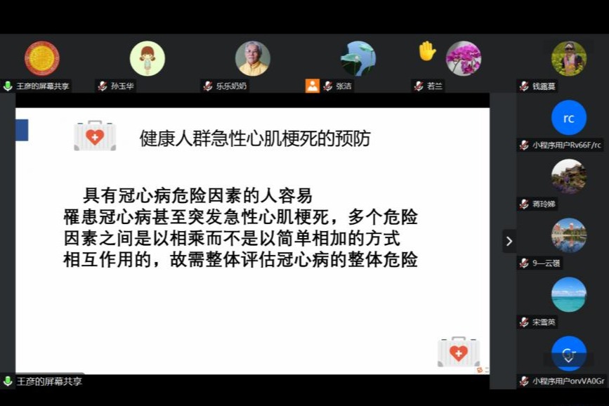 5月10日晚,澳门网上博彩邀请北京市红十字会急诊抢救中心大夫王彦为离退休教职工带来线上健康讲座《心梗、脑梗的预防》。这是继4月12日《从饮食营养入手,提高老年人免疫力》主题健康讲座后,附中举办的第二次线上健康讲座。参与此次讲座的离退休教师共有三十余人。党委副书记兼离退休领导小组组长张洁主持讲座。