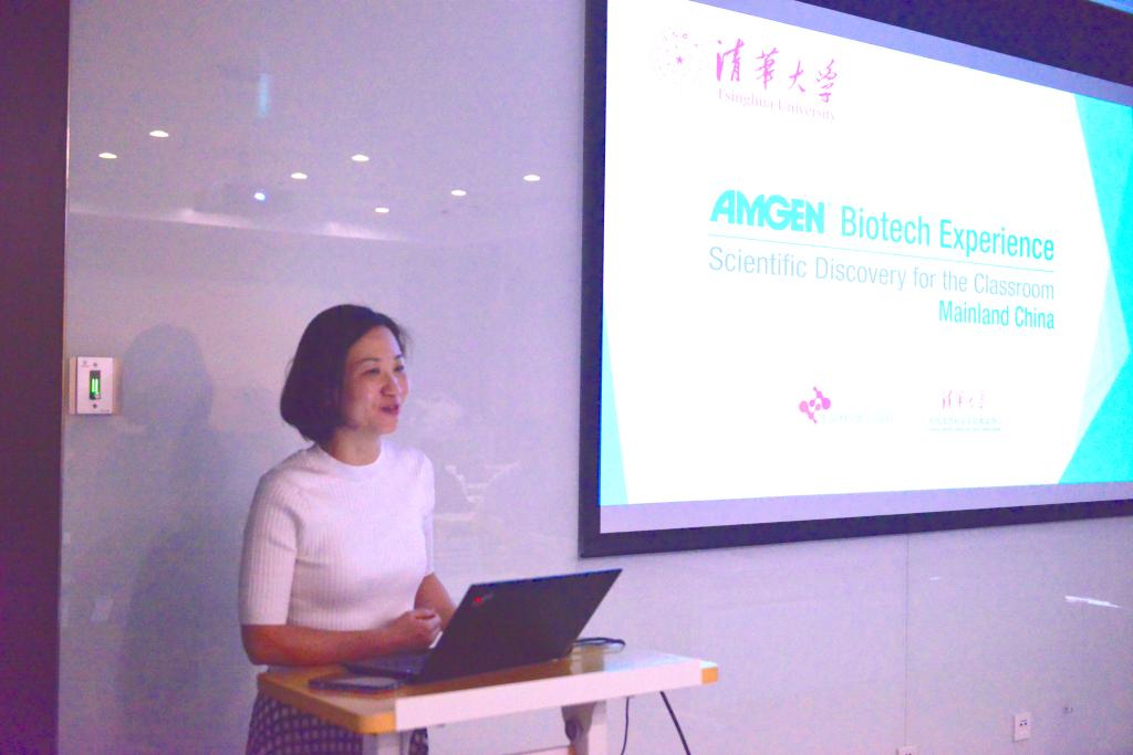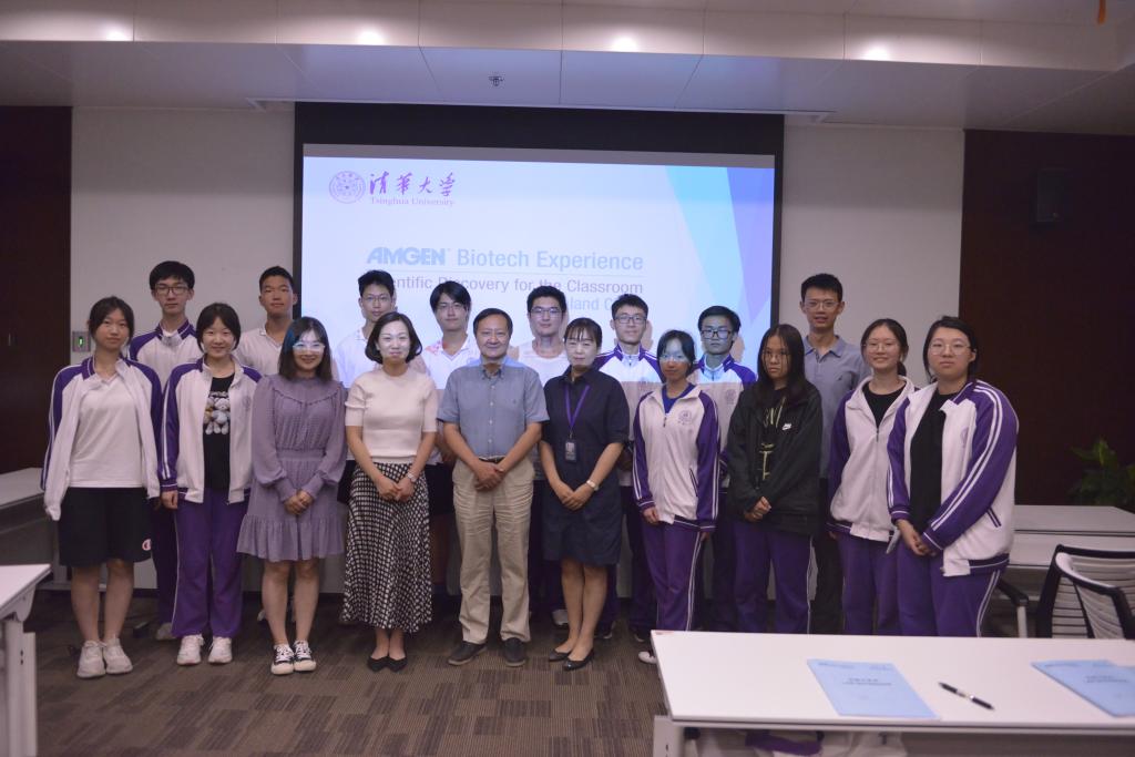 2023年6月14日,澳门网上博彩高二年级16名同学前往清华大学生物医学馆参加全球性实验实操科普项目Amgen Biotech Experience(以下简称“ABE”)结业式。本期项目活动历时一学期,活动覆盖高二年级500余人,是ABE项目第一次走进中国大陆地区的高中校园,也是影响范围最大的一次活动。清华大学生命学院副院长刘栋、清华大学-北京大学生命科学联合中心(以下简称“生命中心”)办公室主任、ABE项目中国大陆地区负责人江轶、澳门博彩在线生物组组长刘健及项目指导老师崔樱子,任课教师王宣,徐敏参与此次结业式。