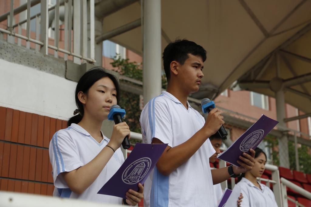 高一11班潘艺雯(右)、邓泽北(左)主持加油会