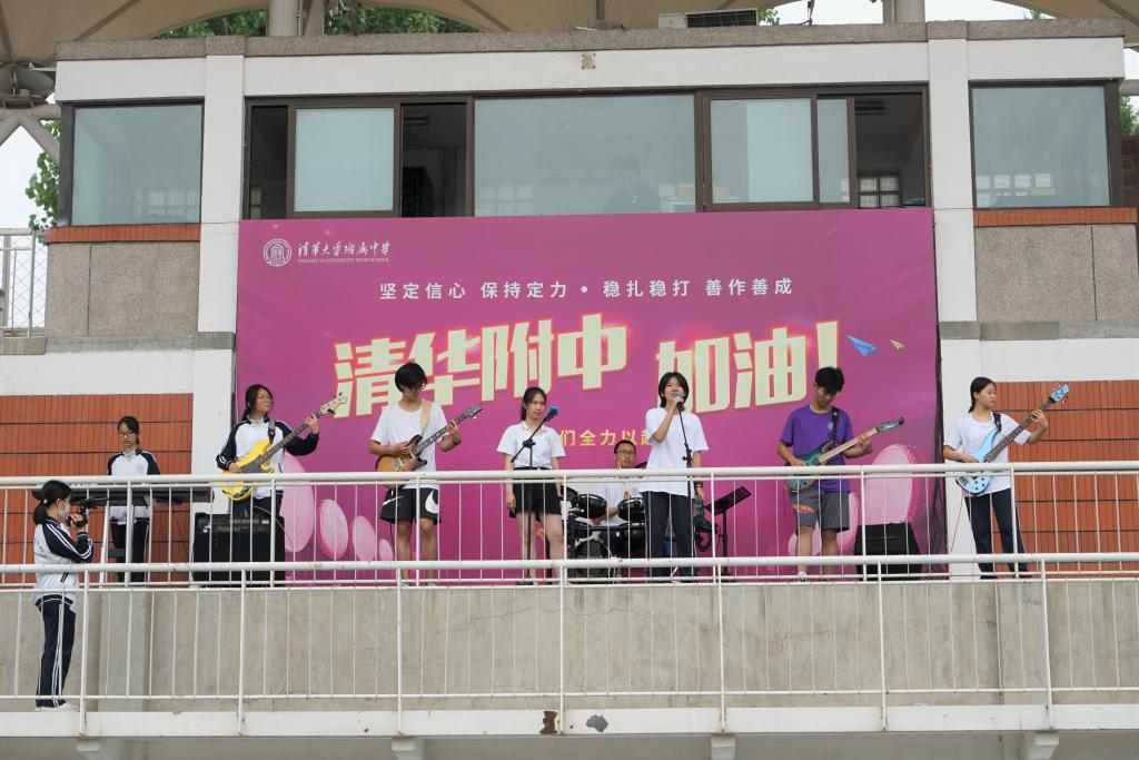 听,来自附中学长学姐的加油声已经响起。电声乐队为初20级同学们带来了一首《中考加油歌》。蓬勃向上的旋律和歌词唱响着对初三同学们的激励,给予他们坚定走向未来的动力和信心,将中考加油会的气氛推向了高潮。
