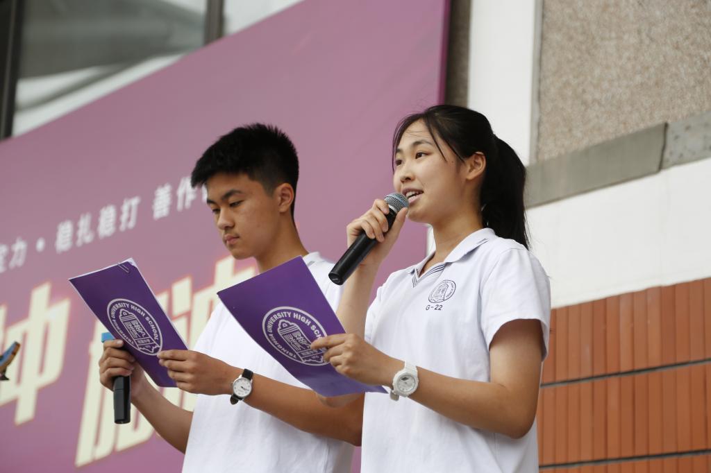 加油会由高一11班潘艺雯同学、邓泽北同学主持。他们带领大家回顾了初20级三年来的在校生活。同时,他们祝愿学弟学妹们能够在中考考场上挥毫泼墨、书写华章。