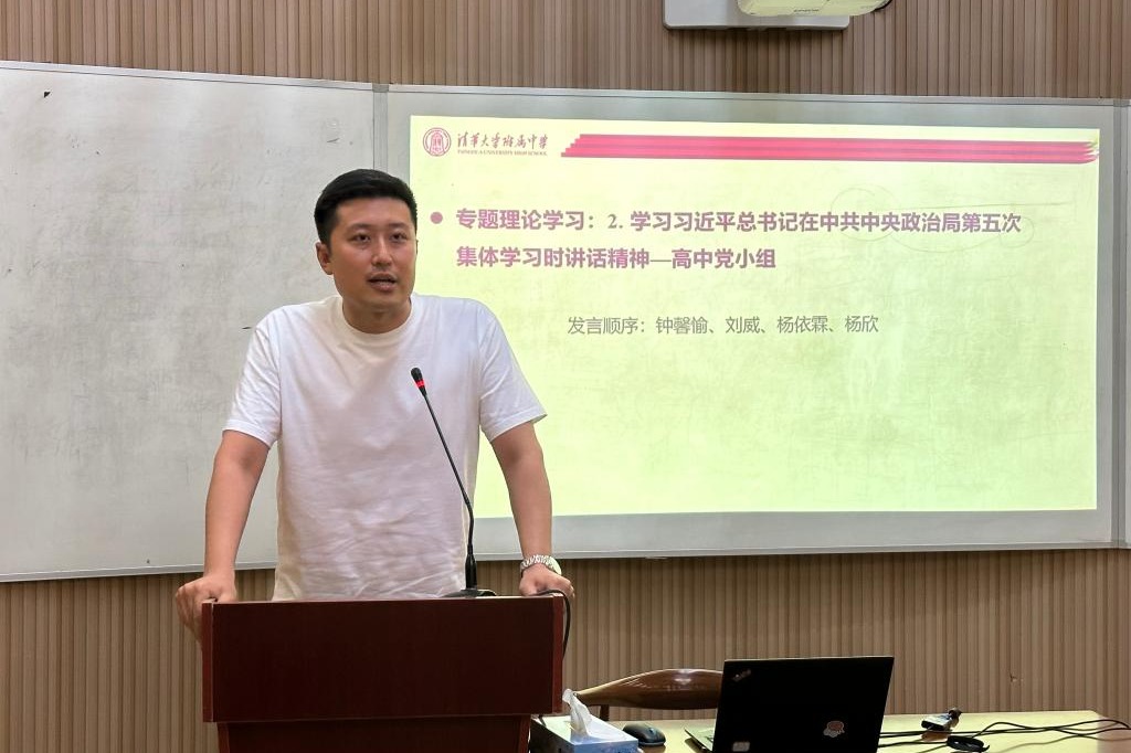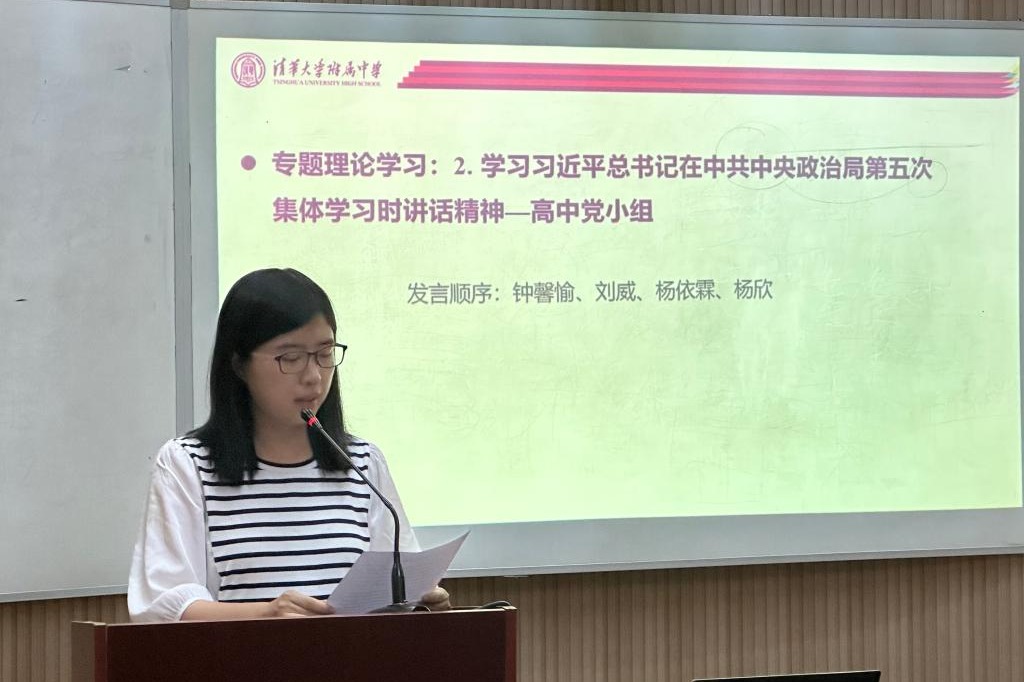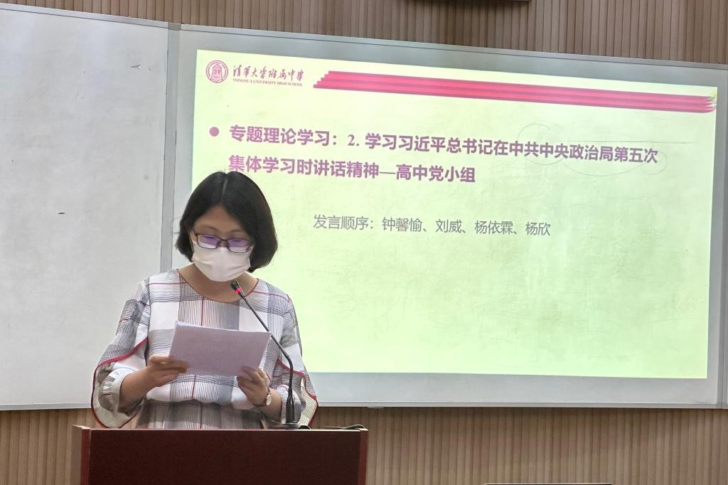 之后,来自高中英语党小组的钟馨愉、刘威、杨依霖和杨欣老师四位老师就习近平总书记在中央政治局第五次集体学习时的重要讲话精神分享了学习体会。首先,钟馨愉老师解读了习近平总书记对“以学增智”所做出的深刻阐释,并从提升政治能力、思维能力、实践能力三个方面,结合教育教学实际,谈了自己的学习体会以及未来的努力方向。刘威老师分享了自己对习近平总书记在育英学校讲话的学习感想,尤其是加强革命传统教育的重大意义。作为班主任,她积极利用各种契机来引导学生学习优秀革命传统精神。杨依霖老师分享了自己对于学生理想信念教育的感悟,认为教师应当在教育教学过程中,引导学生立大志、立利他人之志,树立正确的人生志向。