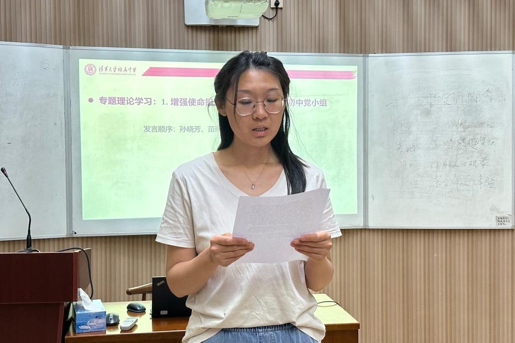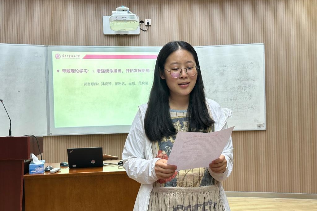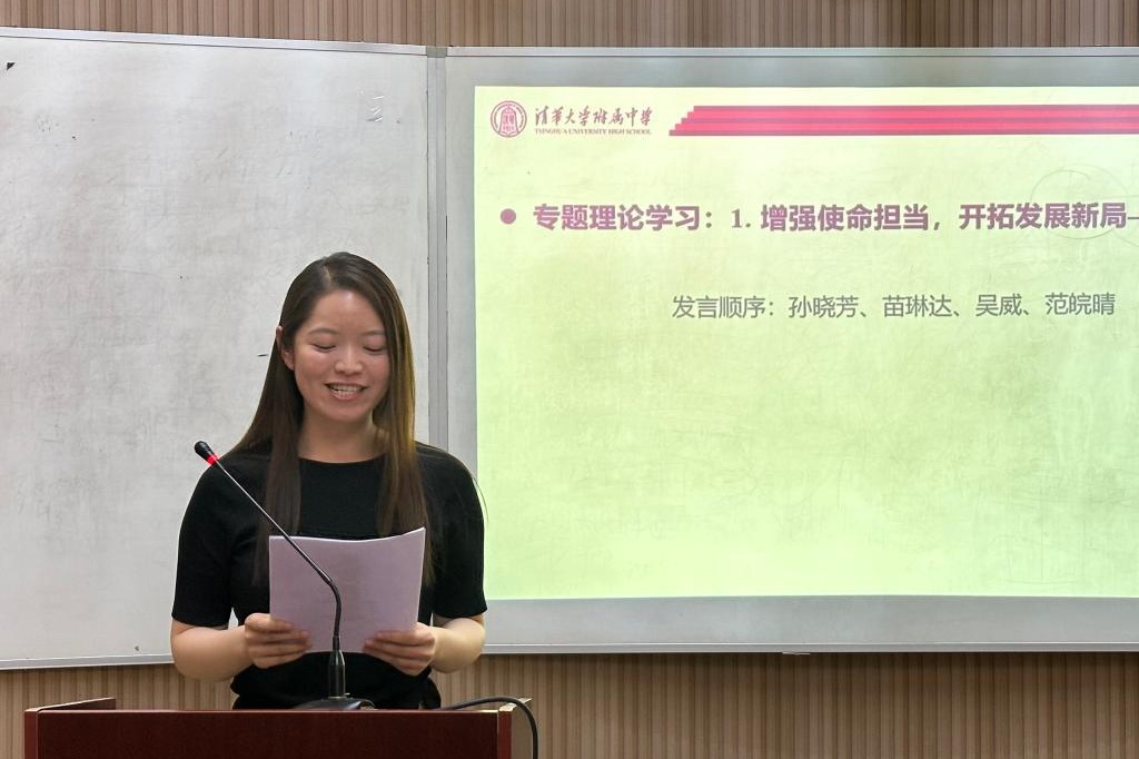 本次组织生活的第一部分是专题理论学习体会和成果分享。专题一是“增强使命担当,开拓发展新局”,来自初中英语党小组的孙晓芳、苗琳达、吴威和范皖晴四位老师就该专题学习进行分享。孙晓芳老师从专业知识能力、学生个性化发展、家校合作及教育教学理念方法等四个方面介绍了自己的学习心得。苗琳达老师从附中实际出发,谈了自己对教育强国的理解,并坚定了作为附中教师,潜心教书育人的信念。而吴威老师作为初三教师,讲述了自己在教育教学实际中以身作则、关注学生个体差异、参与教育教学改革以及加强家校沟通的感悟。
