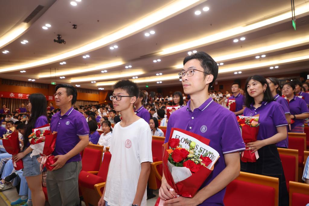 毕业典礼第七项给老师献花。这一环节也一改全体老师上台的传统方式,而是全体老师跟着同学们坐在观众席保持不动,由各班代表走进观众席给每位老师送上献花。红色的花束捧在每位老师手里,点缀在全场每一处,显得格外醒目。