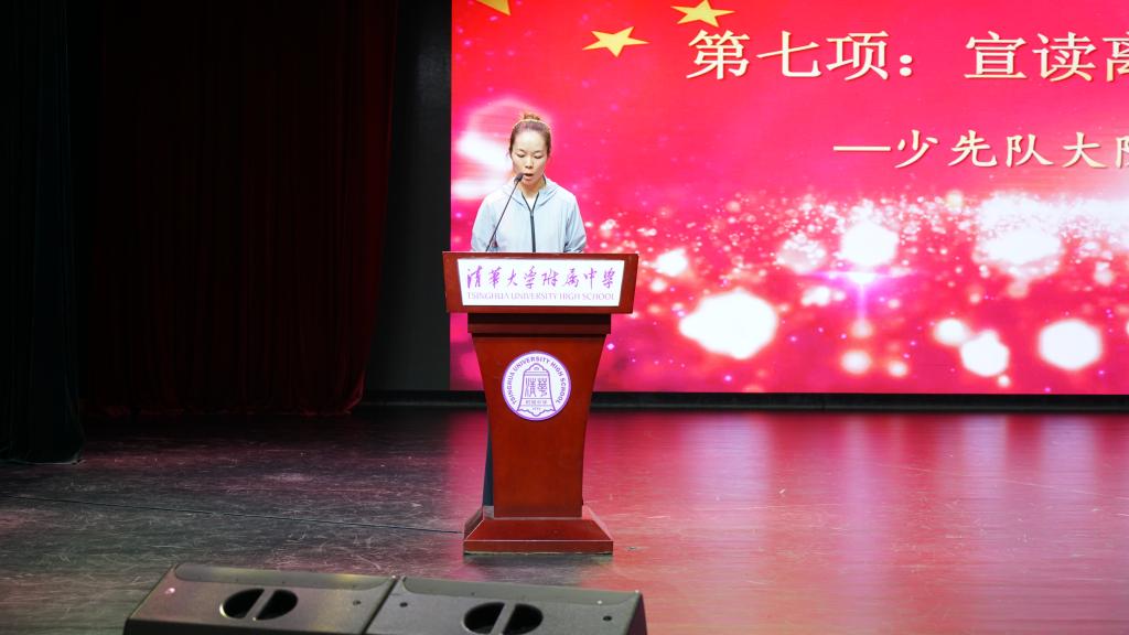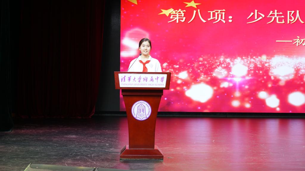 优秀少先队员代表初2112中队的马明玥同学发表演讲,她讲述了自己从一个懵懂的少年,带着无限憧憬加入少先队,成为一名合格的少先队员。在澳门博彩在线大家庭里,跟许许多多优秀的少先队员一起成长和历练,参与了学农课程、社会实践等一系列重要的年级活动,增长了见识,磨练了意志,体会到了少先队员肩上的责任感与使命感,得到了进步与收获。面对即将到来的青年时代,她坦言自己和全体少先队员们已经做好了准备,将全部的智慧与力量都投入到社会主义事业的建设中去,为实现中华民族的伟大复兴而不懈奋斗。