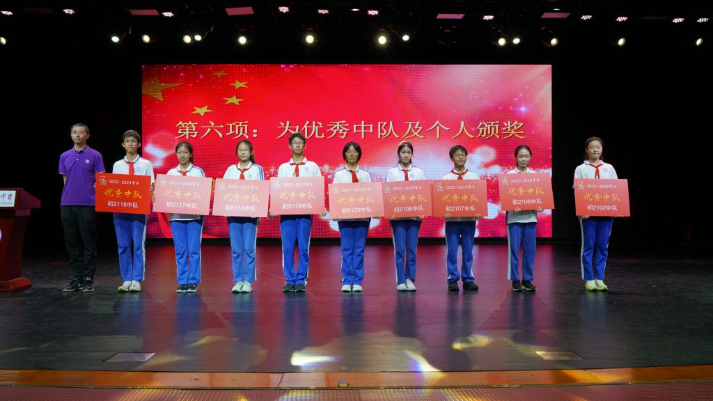 随后,学生发展中心主任王田宣读了初21级年度表彰决定,并为初2102中队、初2106中队、初2107中队、初2108中队、初2109中队、初2113中队、初2114中队、初2117中队、初2118中队颁发“优秀中队”队牌,同时授予304名学生“优秀中队干部”“优秀少先队员”“单项标兵”等个人荣誉称号,由张彪老师和李冰清老师为各中队颁发优秀个人奖状。