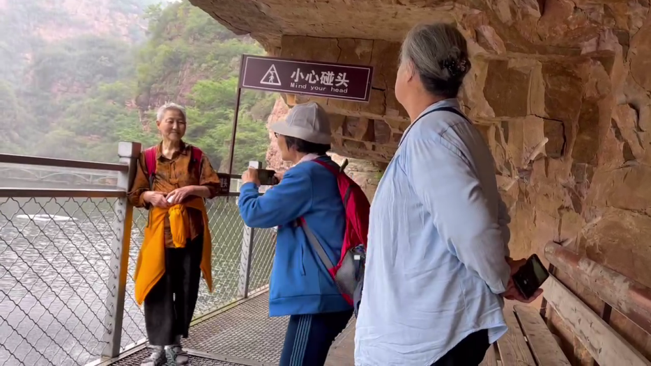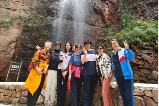 沿着曲曲弯弯的山路前行,途经一线天、回音洞、观音庙等景点,观赏着山上的怪石绿树,罗汉戏水、水帘飞瀑等景致一一映入眼帘。老师们兴趣盎然,一直来到了当年抗日根据地遗址。