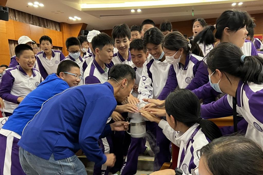 最后是胡杨辅导员带来的“液氮试验秀”。辅导员通过一系列有趣的液氮实验,带领同学们走进了神奇的液氮世界。活动现场充满了同学们的好奇心和惊奇声,让这场液氮试验秀成为了科普活动中的一大亮点。辅导员带着液氮走到同学们中去,让每个同学都能切身感受水蒸气迅速凝结的过程,同学们惊叹于这种神奇的现象。