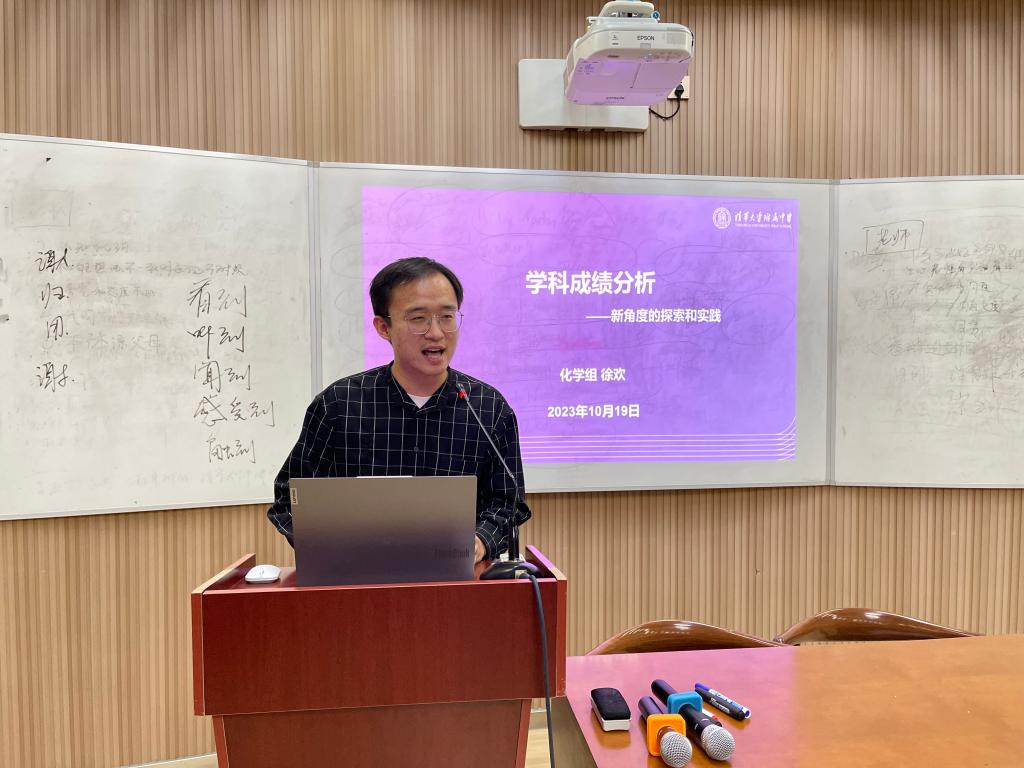 接着,徐欢老师以化学学科成绩分析为例,向教师们介绍新角度的探索与实践。他针对中等生的两极分化现象,从每一个模块的得分率分析该类学生出现变化的原因;并从中位数和平均分的对比出发,向教师们展示了能够体现学生成绩分布和变化的数据图像。