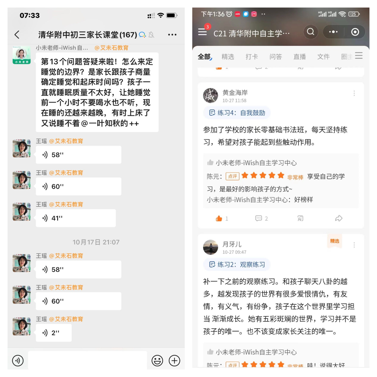 王瑶教授针对家长们的问题,进行线上个性化答疑(左),家长们每日坚持打卡记录亲子沟通(右)