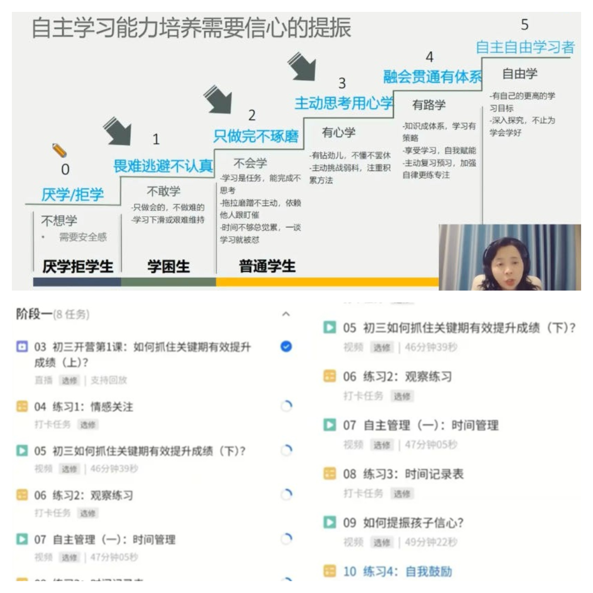 孩子的进步首先源于家长的改变,“自主学习”项目首先把着力点放在家长群体上。每周一晚上8:00,家长认真在平台上学习王瑶教授精心准备的课程,然后根据课程作业,每日打卡。一段时间坚持下来,有些家长改变了,随之而来孩子也有了好的变化。一个多月来,5节线上课程(每次课程约40-90分钟)搭配答疑和练习,王老师由浅入深地引导家长们思考在初三如何抓住关键期有效保障学业、如何提振孩子信心、如何让孩子主动并快乐地爱上学习以及如何处理亲子关系等关键问题。