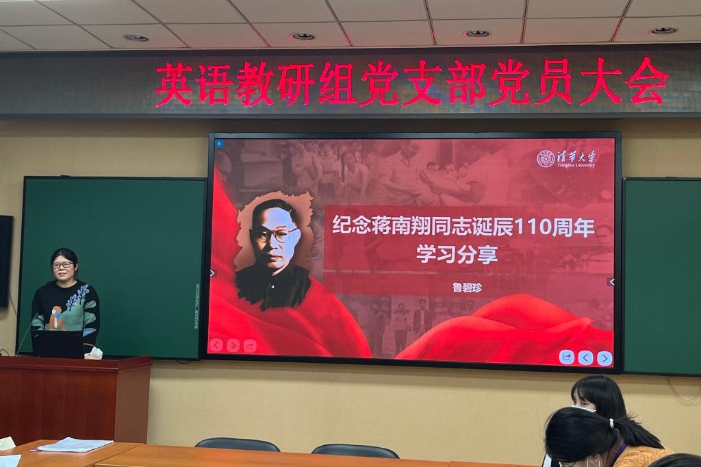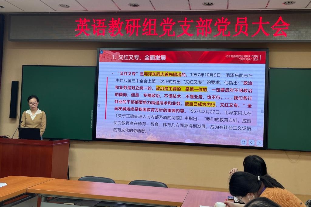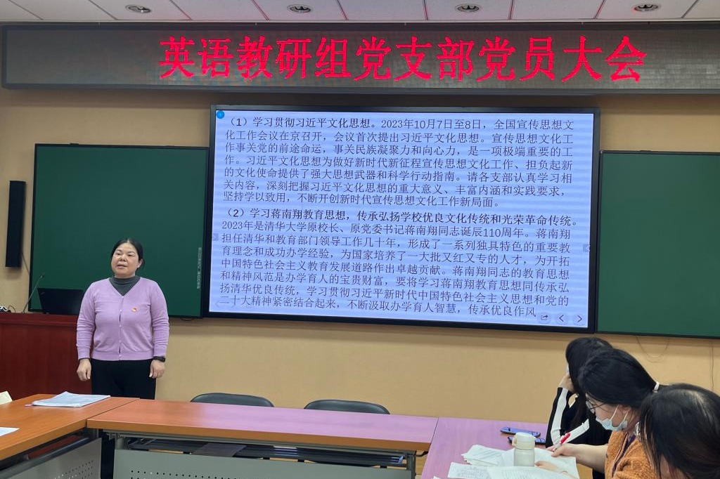 计票期间,支部书记黄丽梅组织全体党员对“习近平文化思想”和“蒋南翔教育思想”进行学习。党课学习之后,党员代表鲁碧珍和杨俊分别谈了体会。鲁碧珍同志介绍了蒋南翔校长并分享了自己对其教育思想的认知。她结合自身在清华求学和在附中工作的经历,分享了她对蒋南翔同志在体育锻炼、志向选择和谦虚谨慎作风培养方面相关论述的学习体会。杨俊同志结合自己的求学工作经历,重点介绍了“又红又专、全面发展”的教育理念和“双肩挑”制度对于清华人的深远影响,并与所有党员教师共勉,力争做到思想过硬、业务能力强,为教育事业的发展贡献自己的力量。