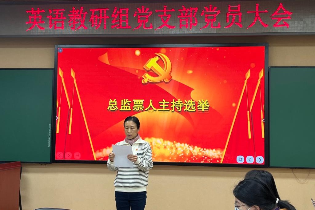 之后,全体党员严格按照程序,选举产生新一届党支部委员。首先,支部书记黄丽梅宣读英语教研组党支部支委会选举办法,全体党员表决通过。接着,黄丽梅同志宣布支部委员候选人建议名单及其简介,全体党员表决通过。然后,黄丽梅同志宣布监票人、计票人建议名单,全体党员表决通过。