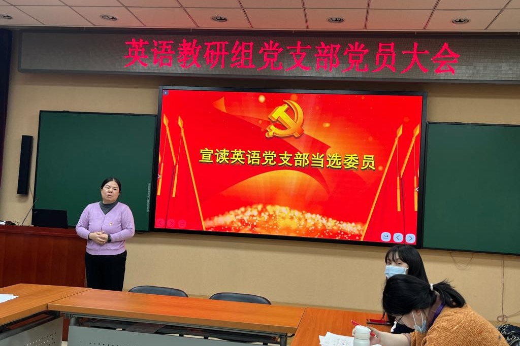 党课学习之后,总监票人报告选举计票结果。支部书记黄丽梅宣布英语教研组党支部新一届支委会当选委员名单。