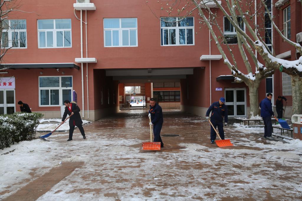 学校后勤保障师傅在清扫校园残雪