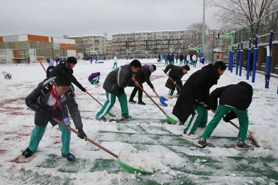 初中学生们积极、认真地扫雪、铲冰